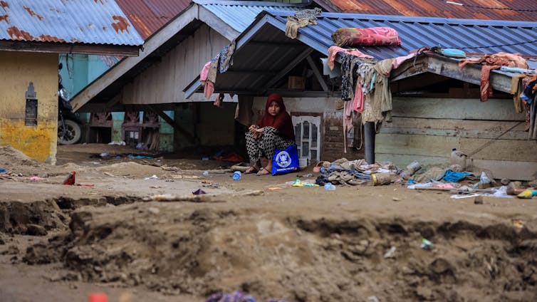 | Seorang perempuan duduk di depan rumahnya yang terdampak banjir bandang yang melanda Provinsi Aceh pada November 2025 lalu. Teuku rizal dc/Shutterstock. |